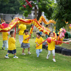2025年9月5日,四川泸州白酒产业园区天骄托育园的老师带领孩子们舞龙。新华社记者 江宏景 摄