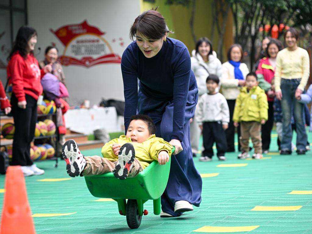 2026年3月6日,在江苏南京建邺区金地名京幼儿园,小朋友和妈妈一起参加亲子游戏。新华社发(方东旭 摄)