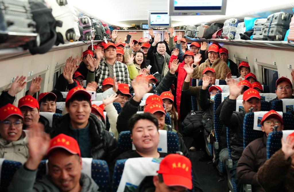 2026年2月24日,在从陕西省西安市西安北站出发的G1922次列车上,来自西安市周至县的务工人员在车厢内合影。当日,82名来自西安市周至县的务工人员免费搭乘G1922次列车,前往江苏省苏州市太仓市,奔赴各自岗位开工。新华社记者 邵瑞 摄