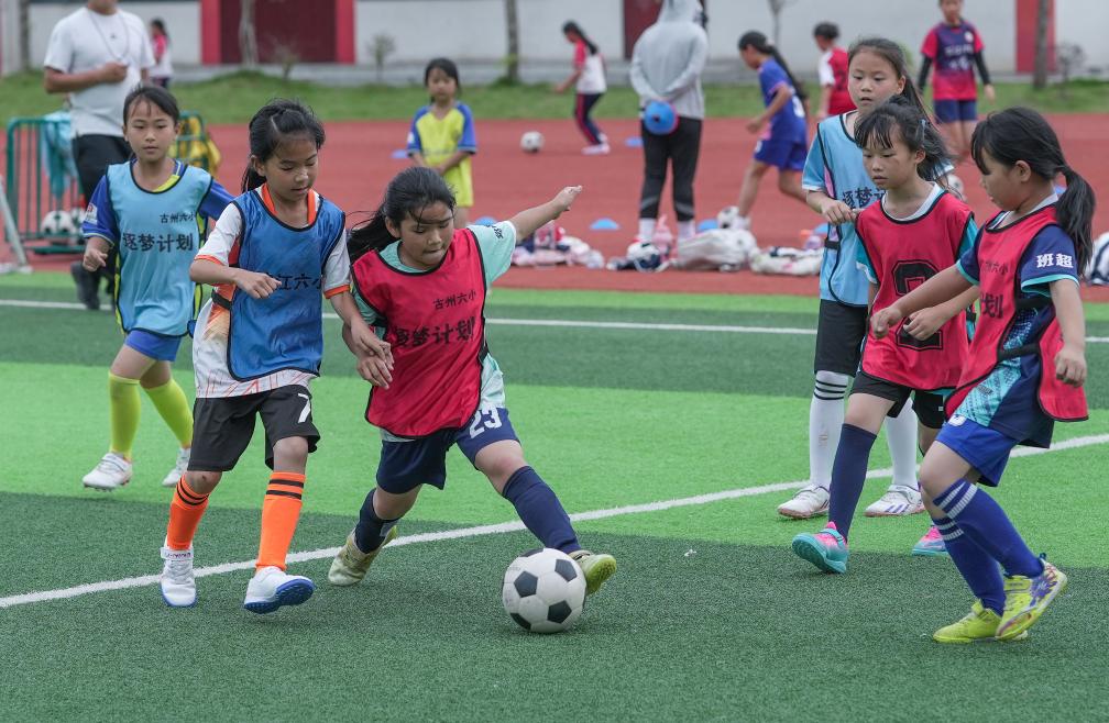 2025年4月25日,在贵州省榕江县古州镇第六小学,学生们在“班超”足球赛中拼抢。新华社发(王炳真 摄)