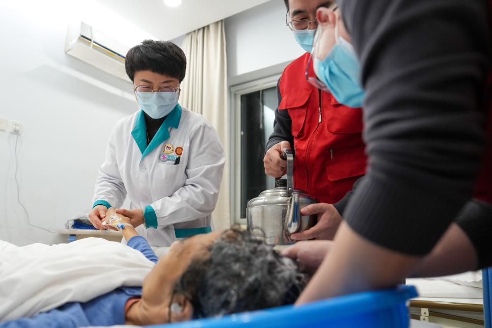 2026年2月5日,在北京市丰台区蒲黄榆社区卫生服务中心,医务社工郭翠红(左一)和志愿者在帮助一名70岁的癌症患者洗头。新华社记者 鞠焕宗 摄