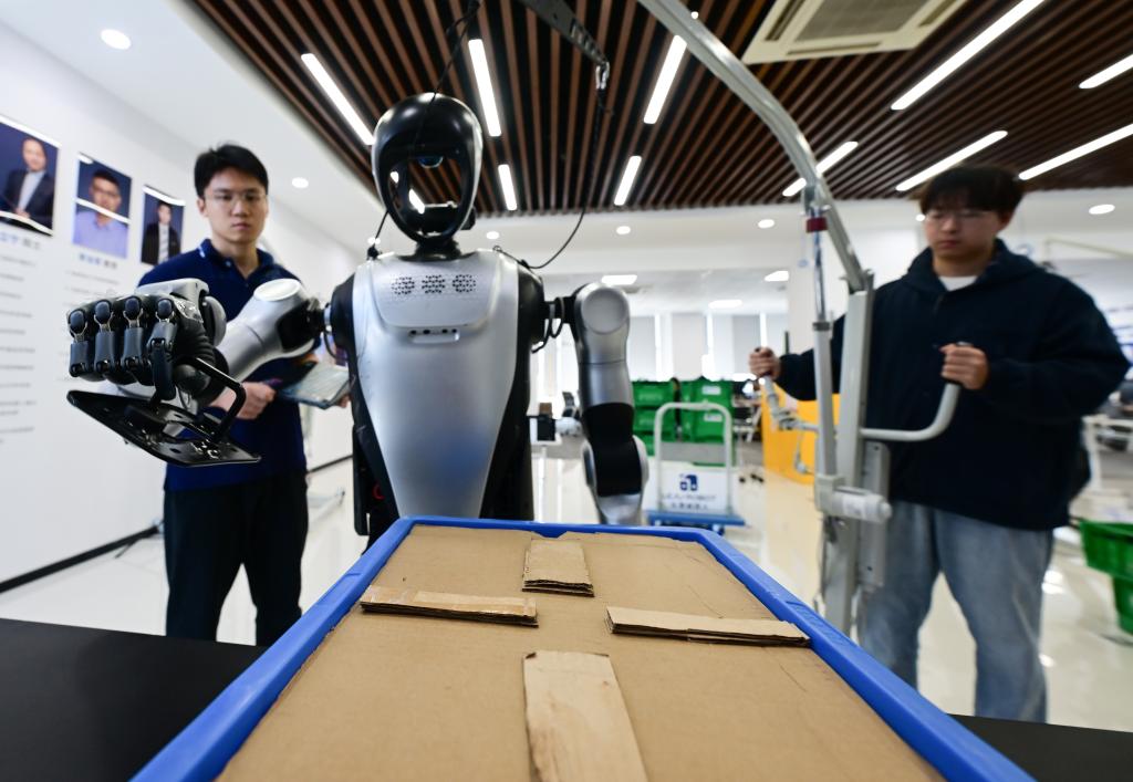 2025年10月24日,张鸿伟(左)在合肥乐聚机器人技术有限公司实验区域内观察机器人抓取零件测试运行情况。张鸿伟是一名机器人应用开发工程师,他通过编写代码、调试模拟,“教”人形机器人进行工业生产任务。
