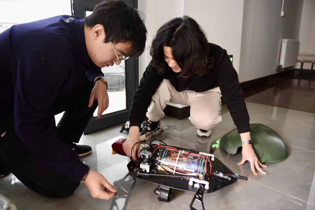 2025年3月18日,储逸尘(左)和同事在沈阳粼动仿生科技有限公司内组装两栖仿生海龟机器人。储逸尘在大学的社会实践中关注到仿生机器人可在渔业养殖中发挥巨大作用,于是在东北大学创立仿生智能实验室,后又创业成立公司,带领团队深耕水下仿生机器人领域,促进渔业养殖提质增效。