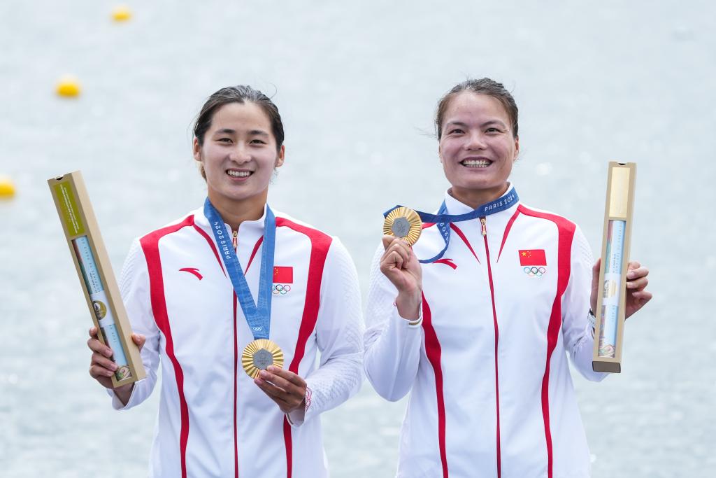 2024年8月9日,中国组合徐诗晓(右)/孙梦雅在巴黎奥运会皮划艇静水女子双人划艇500米决赛中夺得冠军后,在颁奖仪式上展示金牌。