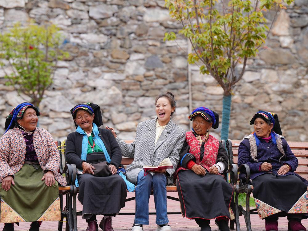 2025年5月16日,全国人大代表、四川省阿坝藏族羌族自治州马尔康市老年养护院院长格西王姆(中)和养护院的老人们交流。格西王姆除了管理和照料老人们的饮食起居,还把国家对老人们的关心关爱政策用“摆龙门阵”的方式传达给他们,将养老产业未来的发展前景及时分享给年轻同事和护工们。