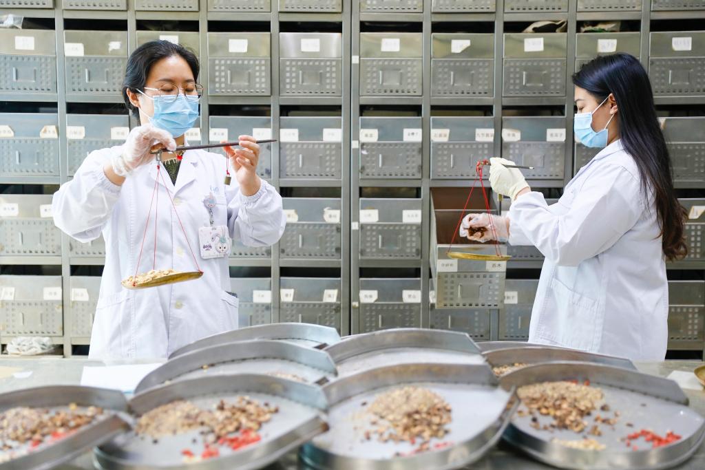 2025年10月22日,江苏省海安市中医院青年中药师在中药房为患者抓药。新华社发(顾彬斌 摄)