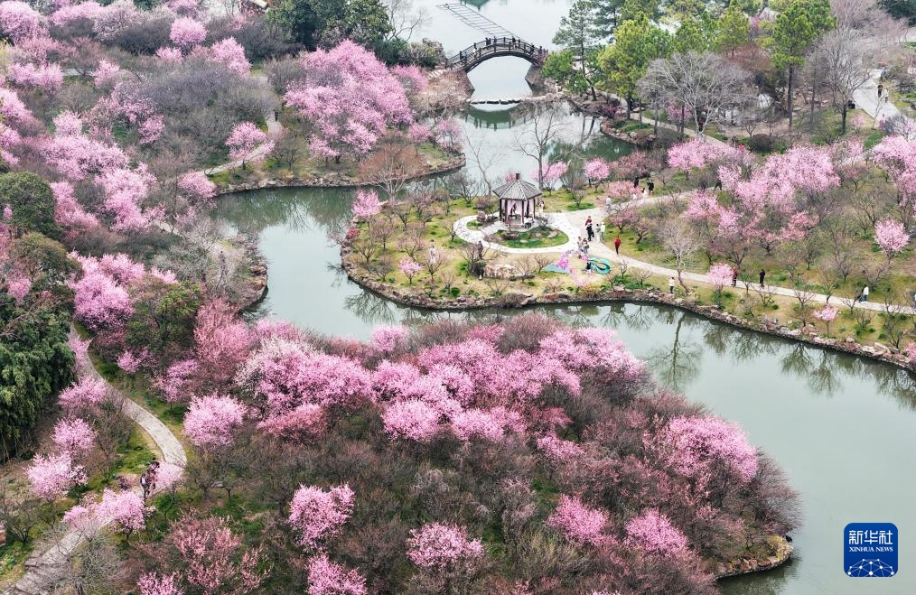 3月15日,游客在江苏扬州瘦西湖风景区赏花游玩(无人机照片)。