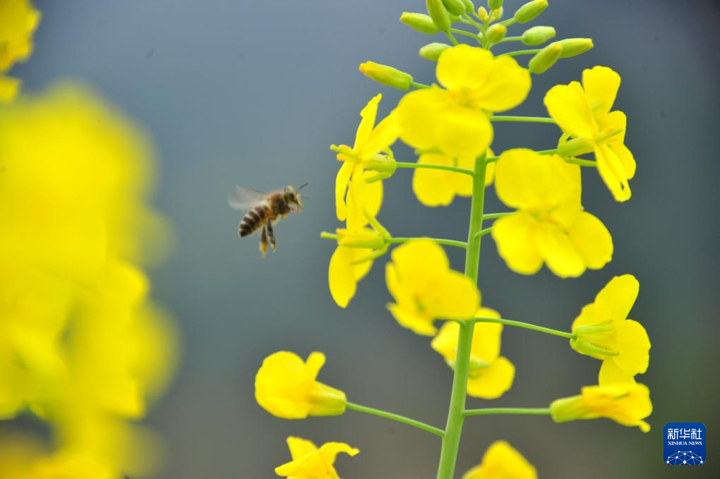 3月19日,蜜蜂在广西河池市罗城仫佬族自治县新印村油菜花间徘徊。