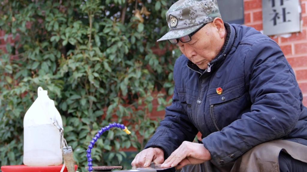 孟来发正在帮村民磨刀。新华社发(王永涛 摄)