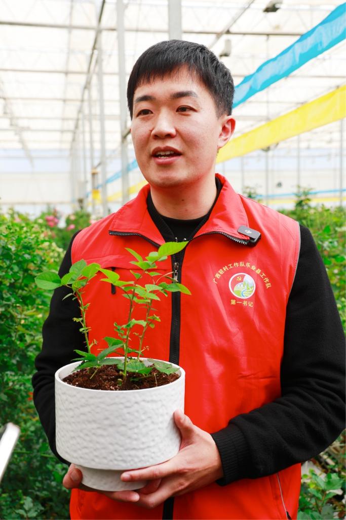 中共百色市委宣传部派驻百坭村第一书记陈竑任手持“文秀”月季花苗(3月18日摄)。新华网 赵普凡 摄