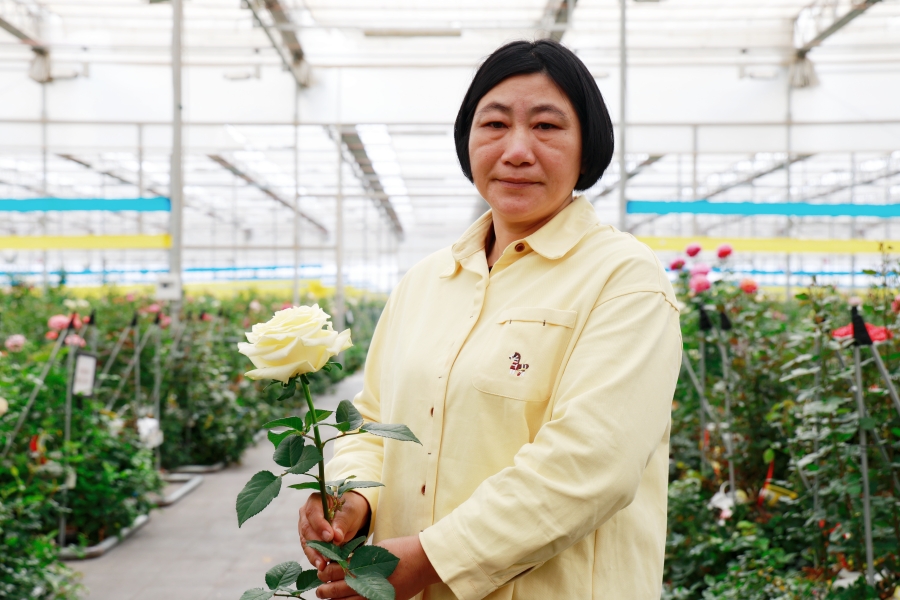 云南省农业科学院花卉研究所蔡艳飞团队发布“文秀”月季花语(3月18日摄)。新华网 赵普凡 摄