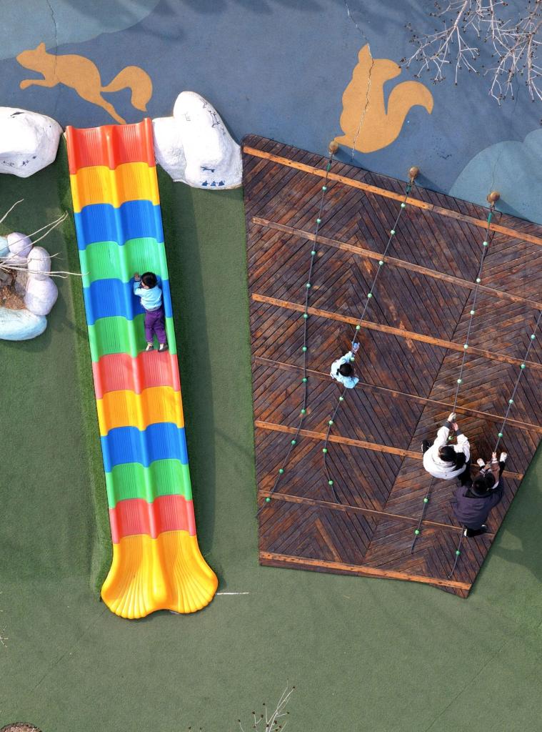 ↑3月27日,游客在雄安郊野公园玩耍(无人机照片)。