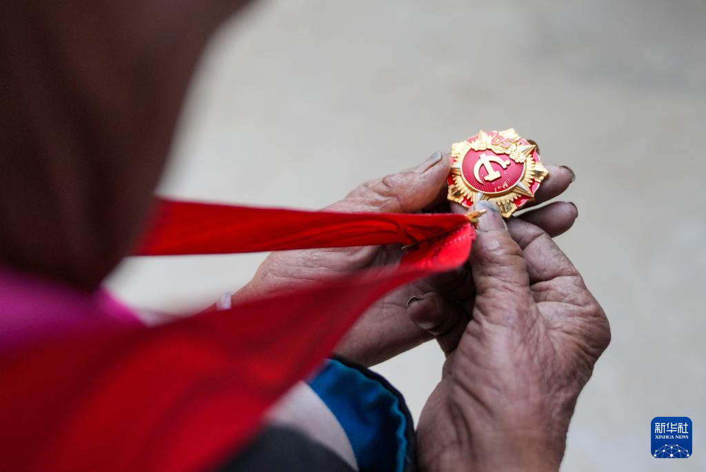 普珍佩戴上“光荣在党50年”纪念章(3月12日摄)。