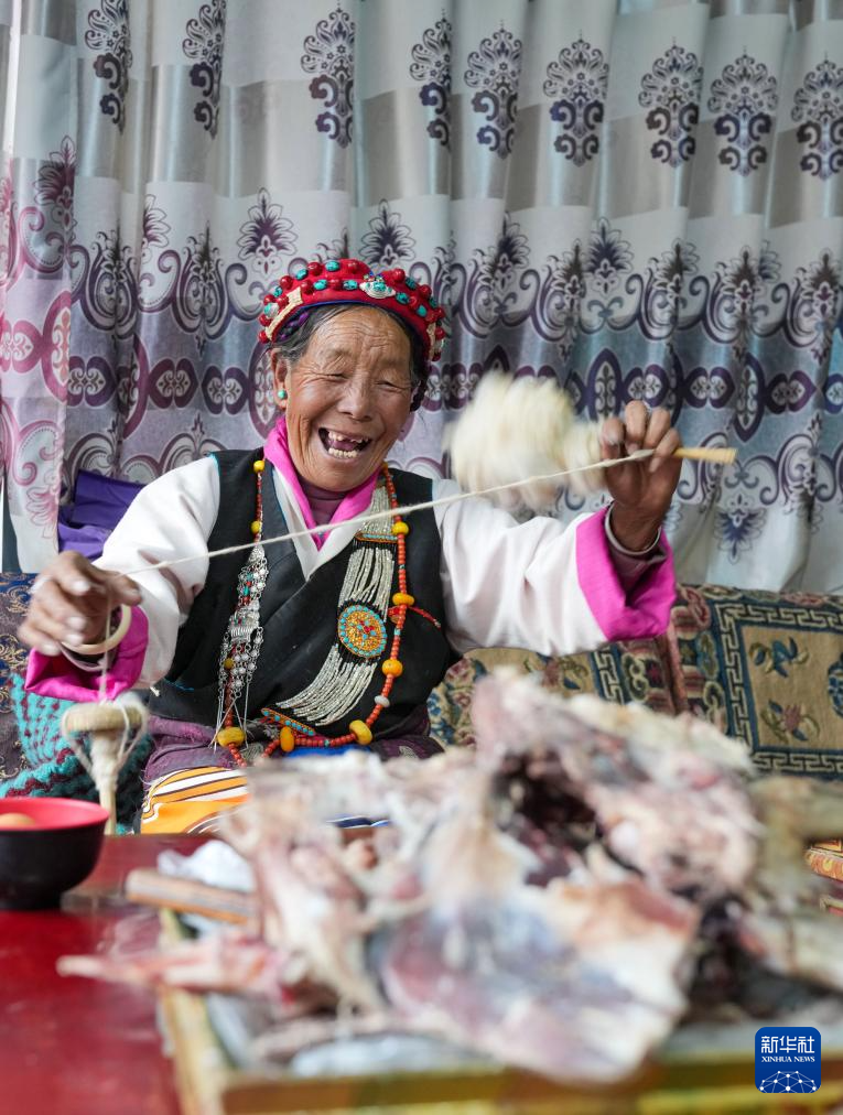 普珍在家纺羊毛线(3月12日摄)。