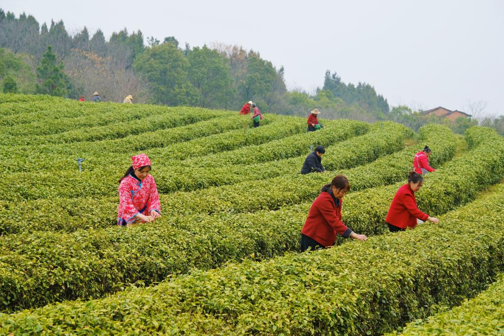 在湖北省天门市陆泉生态茶园,漫山茶树青翠欲滴,游客们腰挎竹篓,在茶农指导下采摘珍贵的“明前茶”。