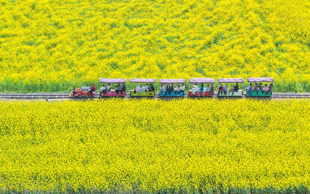 4月4日,游客在江苏省淮安市盱眙县黄花塘镇向阳花海乘坐小火车游玩(无人机照片)。新华社发(许昌银摄)