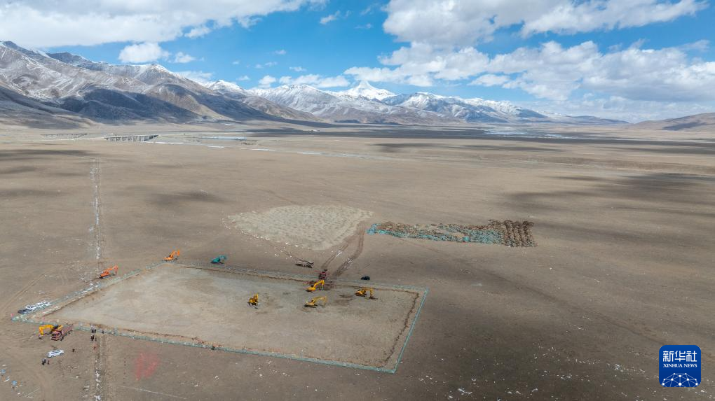 这是中广核西藏当雄乌玛塘50兆瓦光热电站破土动工现场(4月6日摄,无人机照片)。4月6日上午,中广核西藏当雄乌玛塘“光热+光伏”一体化项目中的50兆瓦光热电站在拉萨市当雄县乌玛塘乡正式开工建设。据中广核光热技术型号首席专家尹航介绍,该项目场址海拔4550米,是目前全球海拔最高的槽式光热电站。新华社记者 丁增尼达 摄