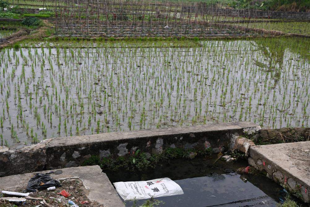 在西南某地,尿素包装袋被丢弃在农田旁的灌溉水渠内(4月2日摄)。