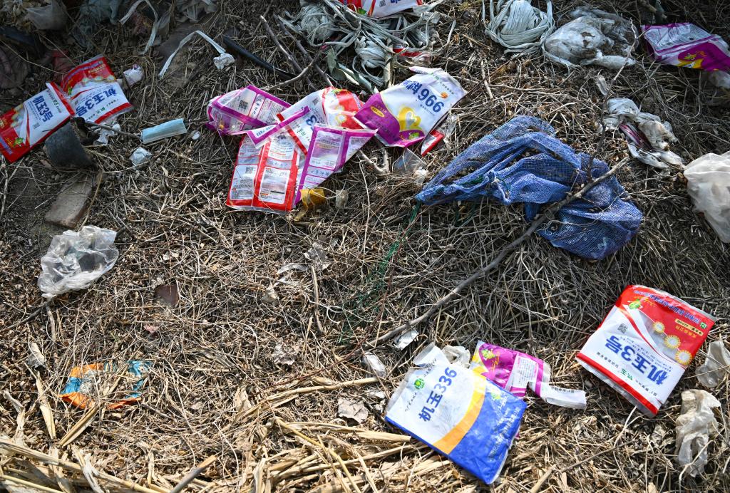 在西南某地一处农田,化肥袋等农资废弃物被随意丢弃在田间地头(4月4日摄)。