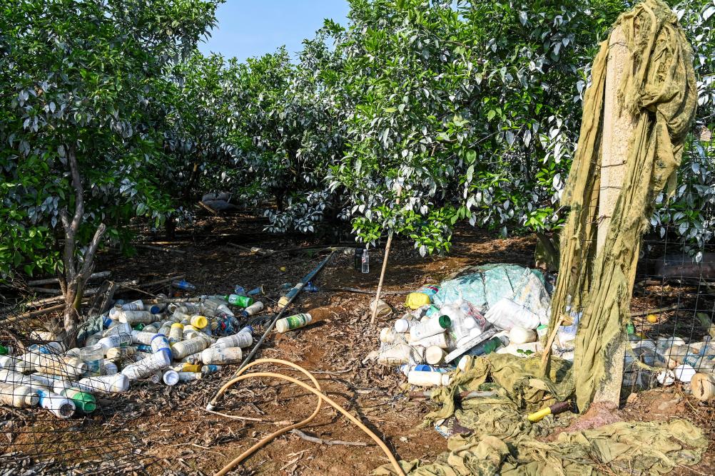 在西南某地一处果园,大量废弃的农药瓶、肥料瓶被随意丢弃(4月4日摄)。