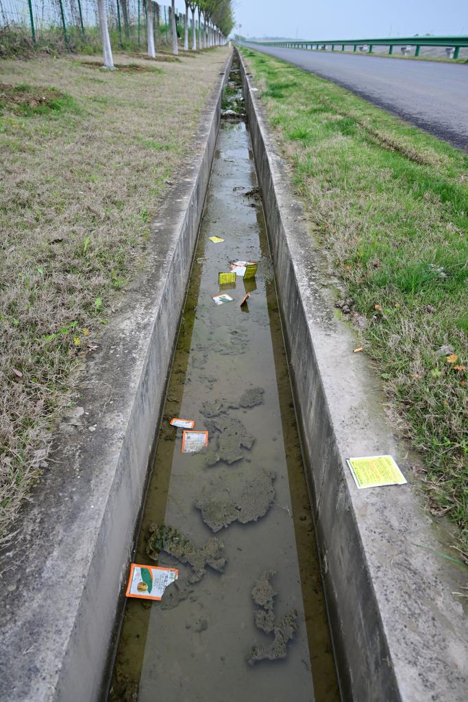 在华东某省,多个农药瓶和农药包装袋被丢弃在一处农田和水渠中(4月2日摄)。