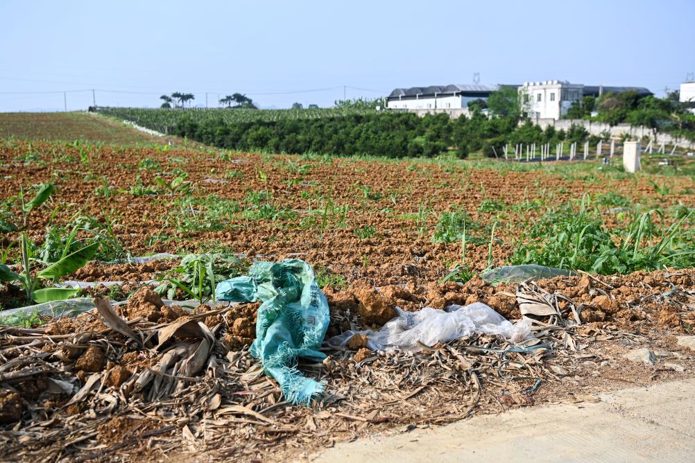 在西南某地一处农田,废弃地膜等农资废弃物被丢弃在田间地头(4月4日摄)。