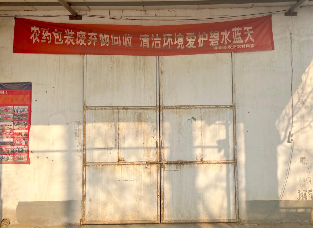 这是在中部某省一农资经销点拍摄的横幅——“农药包装废弃物回收 清洁环境爱护碧水蓝天”(4月1日摄)。记者采访得知,2022年该地鼓励各农资经销点开展农资废弃物统一回收,并按重量给予相应现金奖励。活动开展后,不少村民把种子袋、农药瓶等农资废弃物收集起来,前往各农资经销点进行废物置换,但活动开展一年便停滞。目前,该经销点农药包装废弃物回收桶已成垃圾桶。来此采购种子、农药的农民坦言,种子袋、农药瓶卖给收废品的也不值钱,用完就随手扔到农田旁的沟壑里。