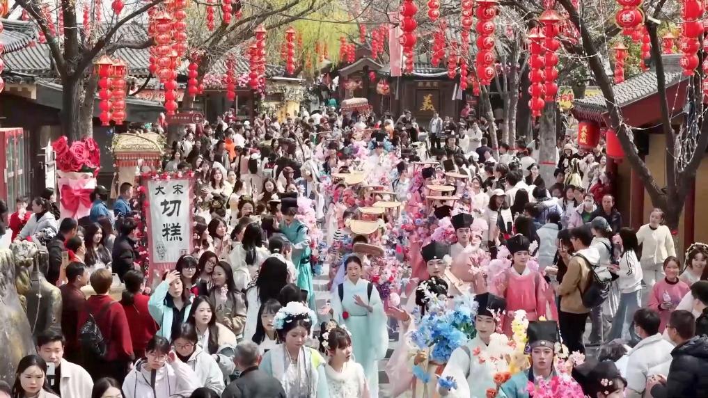 河南开封各景区将清明习俗与宋文化深度融合。在清明上河园景区,游客可在“大宋簪花游园会”参与互动赢取鲜花。