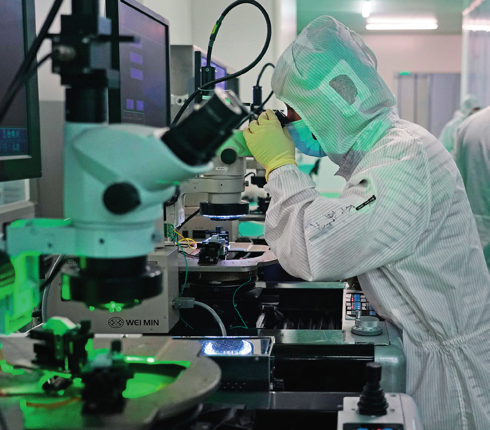 在位于江西省南昌市的南昌大学国家硅基LED工程技术研究中心,技术人员正在对芯片进行电性测试(2024年4月3日摄)。万象摄/本刊