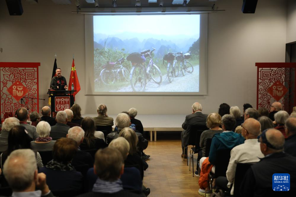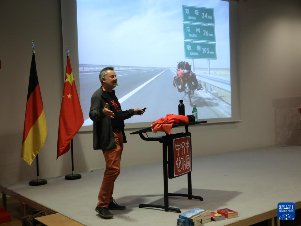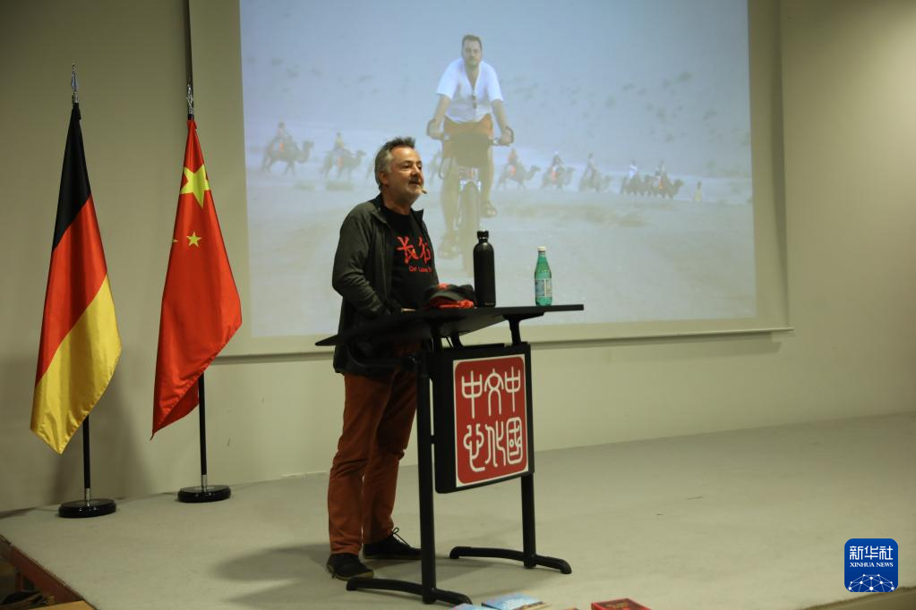 4月9日,在德国柏林中国文化中心,德国旅行作家福尔克·黑林分享在中国的骑行之旅。新华社记者 杜哲宇 摄