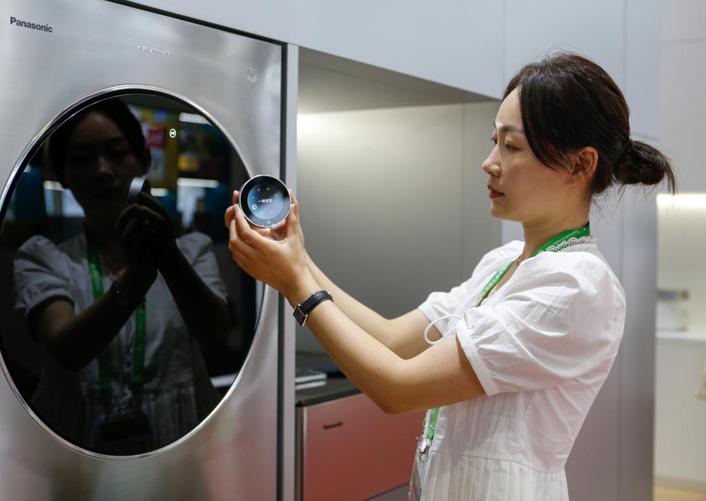第三届中国国际供应链促进博览会上,参展商为观众介绍一款遥控洗衣机。新华社记者 丁洪法 摄