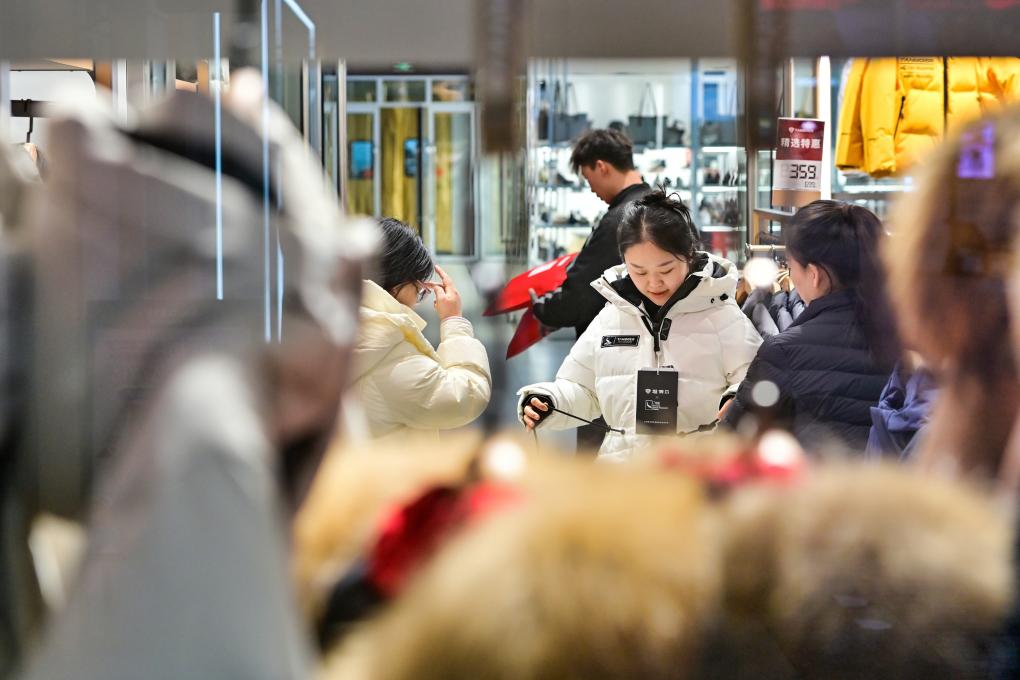 消费者在天津市滨海新区的一家商店选购羽绒服。新华社发(杜鹏辉 摄)