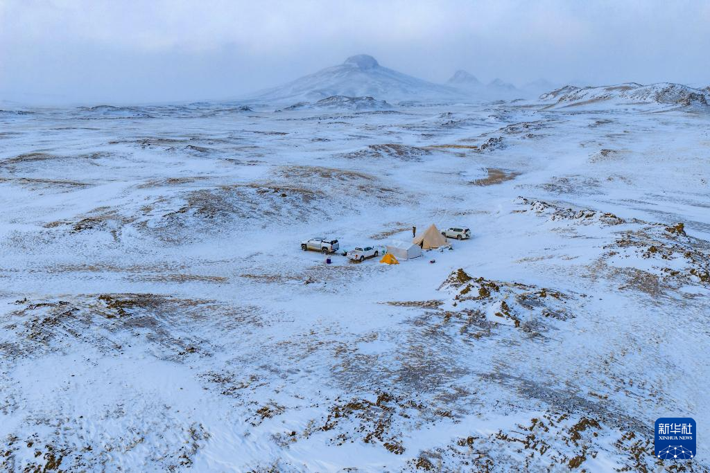 4月11日,羌塘国家级自然保护区那曲地区管理局专业管护队在“巴毛穷宗”地区雪中宿营(无人机照片)。