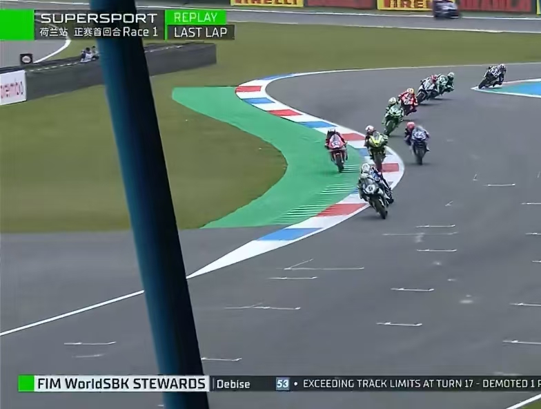 WSBK赛事规则对最后一圈的赛道限制违规有特别规定:若车手在最后一圈超出赛道限制并获得优势,将被罚退一个完赛位置,旨在防止车手在比赛关键时刻通过切弯或驶出赛道获取不正当优势。值得注意的是,该处罚仅适用于最后一圈的获利性违规,常规圈次的赛道限制违规通常以单圈成绩被取消或加罚时间等方式处理。德比斯正是在这一规则下,从原本的第三名被罚退至第四名,领奖台第三的位置由凯旋车队的英国车手阿莫斯递补获得。