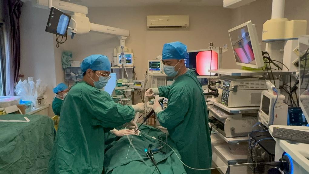 中日友好医院呼吸与危重症医学科主任医师侯刚应用自主研发转化的胸腔镜开展呼吸介入手术。(中日友好医院供图)