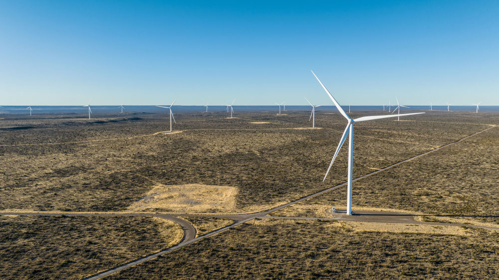 这是2023年6月12日在阿根廷丘布特省马德林港拍摄的罗马布兰卡一期风电场(无人机照片)。罗马布兰卡风电场是阿根廷最大的风电场之一,项目分为六期,其中罗马布兰卡一期、二期、三期和六期风电场,以及位于布宜诺斯艾利斯省的米拉马尔风电场由中国金风科技股份有限公司投资建设,共同组成了赫利俄斯风电项目群。