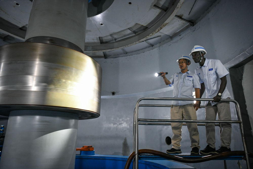 2025年4月24日,在几内亚杜布雷卡省,中几技术人员在凯乐塔水电站的水车室内检查设备运行状况。据统计,凯乐塔水电站项目施工高峰期为当地提供了1500多个工作岗位。自2016年起的项目运维阶段,企业与几内亚政府合作,公开选拔近百名几内亚学员赴华或进入当地高校学习,为该国培养了一批水电专业技术人才,如今他们已经成为几内亚国家电力系统的中坚力量。