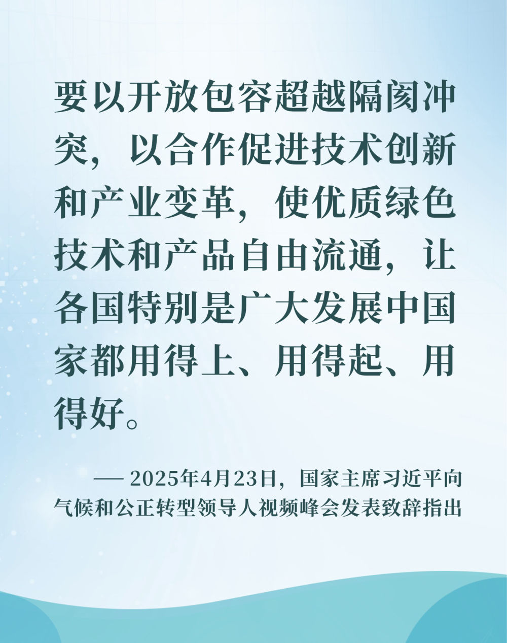 胸怀人类共同的前途命运,习近平主席多次呼吁加强绿色国际合作,共享绿色发展成果。