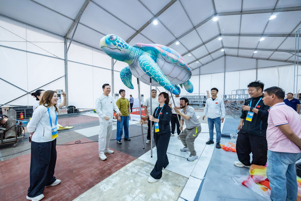 4月12日,演员在彩排中调试海洋生物模型。新华社发(朱启荣摄)
