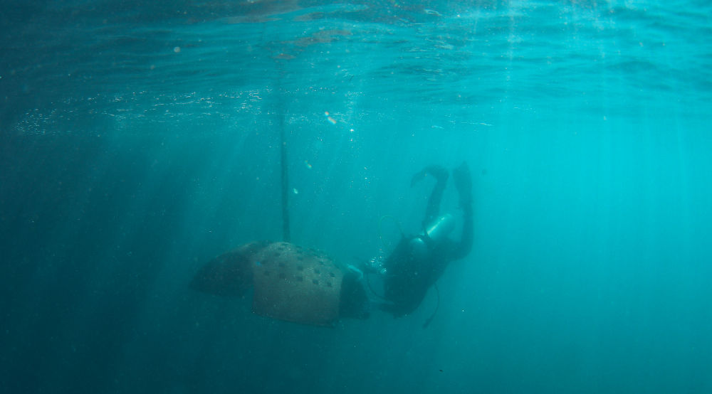 在亚龙湾相关海域,潜水员将人工生态礁移至海底指定区域(2022年1月19日摄)。新华社记者 杨冠宇 摄