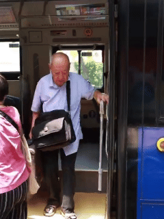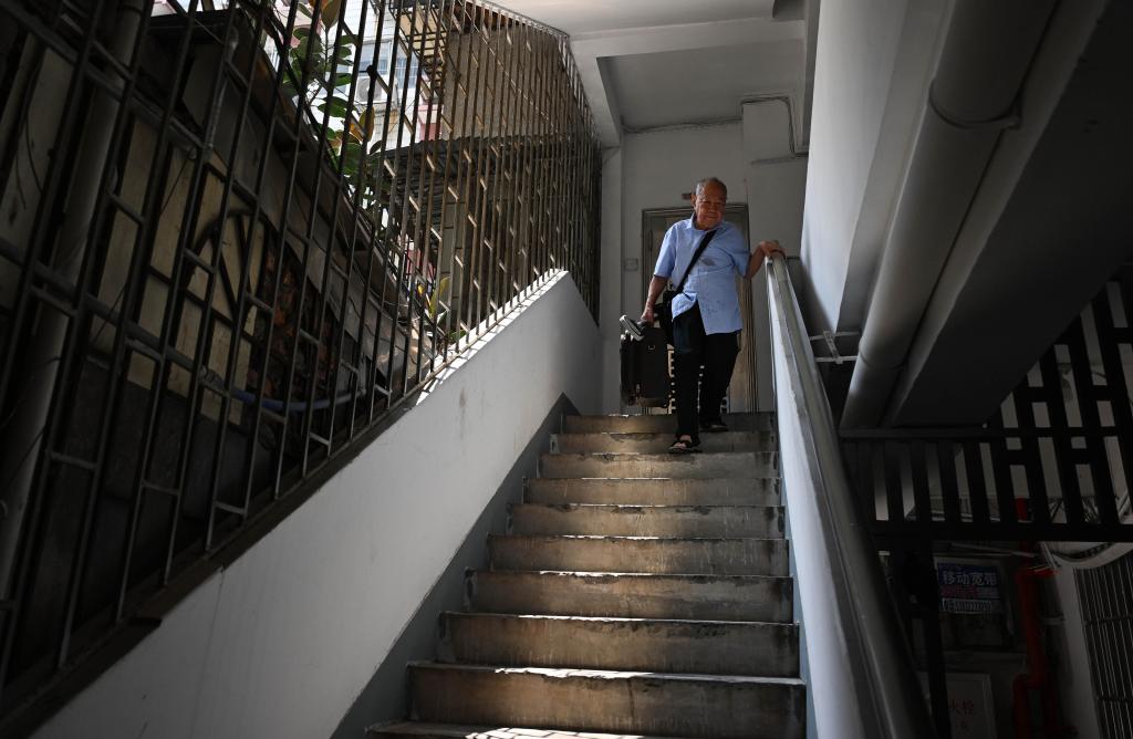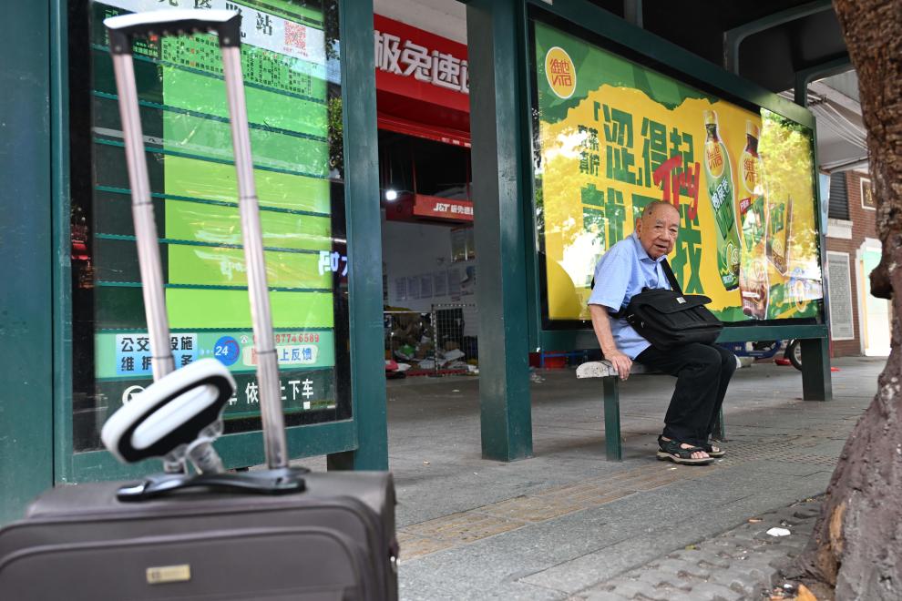 ↑4月19日,林宝山在广州光塔路公交站等车。
