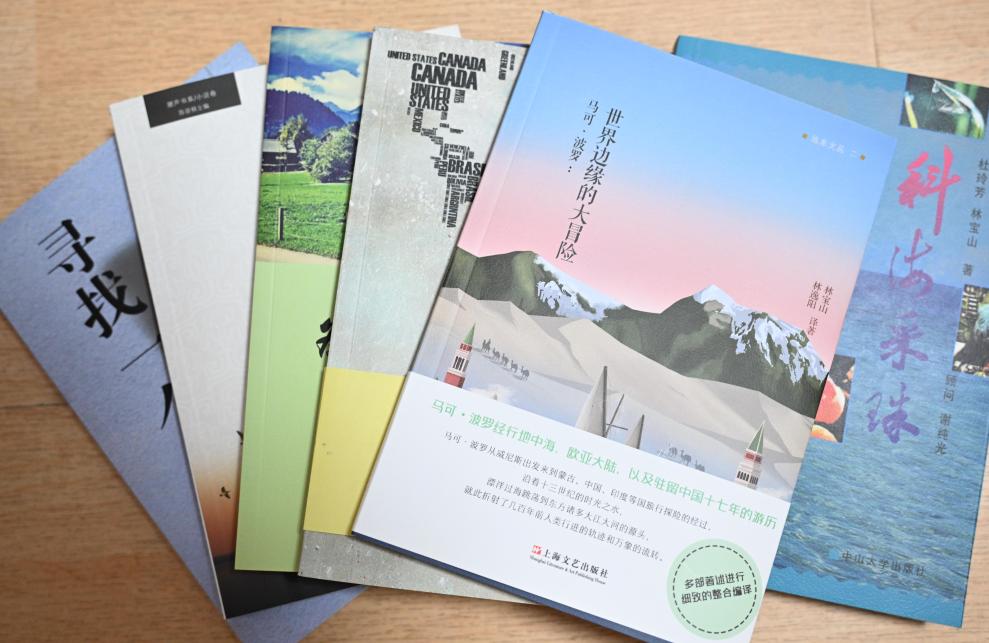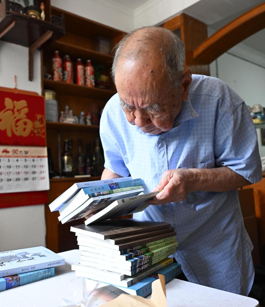 ↑4月19日,林宝山在家中整理书籍,准备出门摆摊。