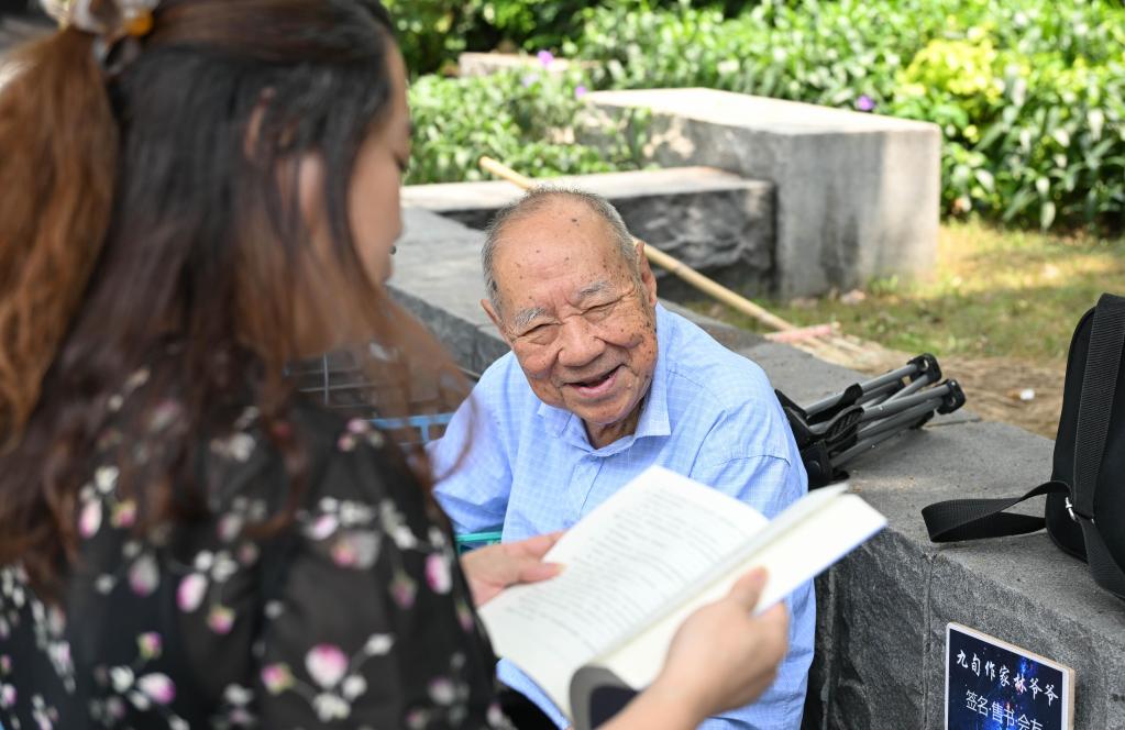 ↑4月19日,林宝山在摆摊卖书时和读者交流。