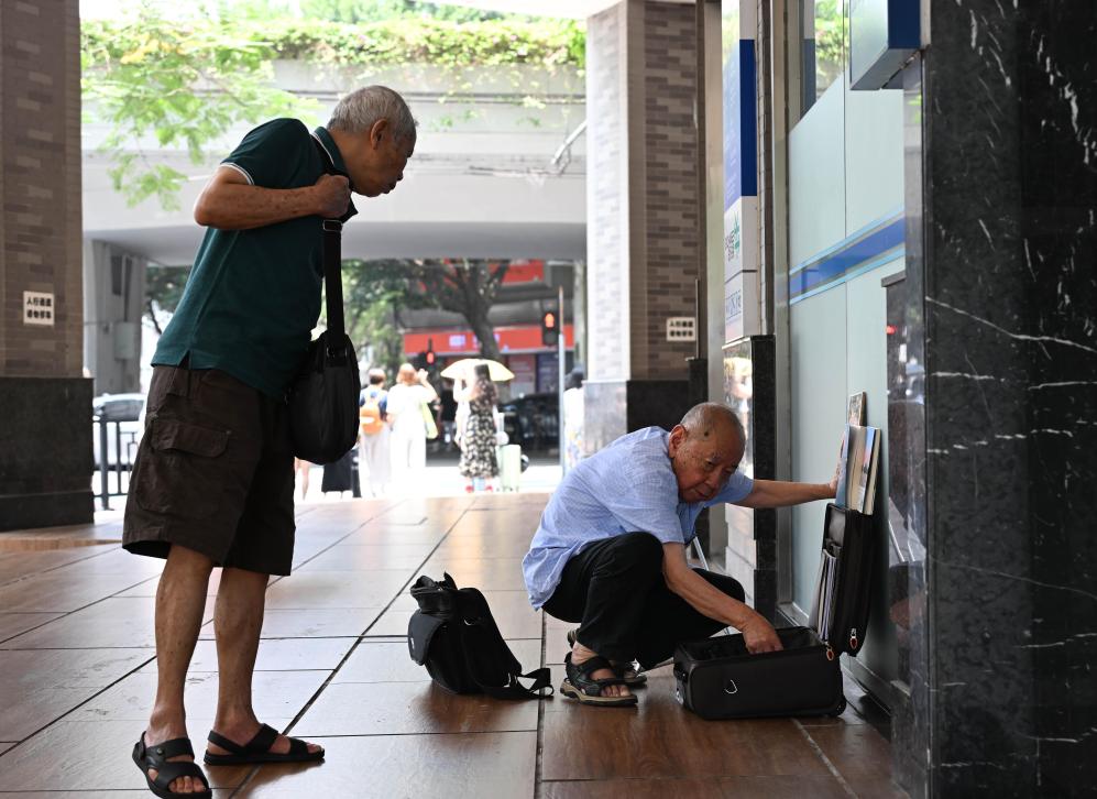 ↑4月19日,林宝山(右)在广州公园前地铁站附近摆摊卖书。