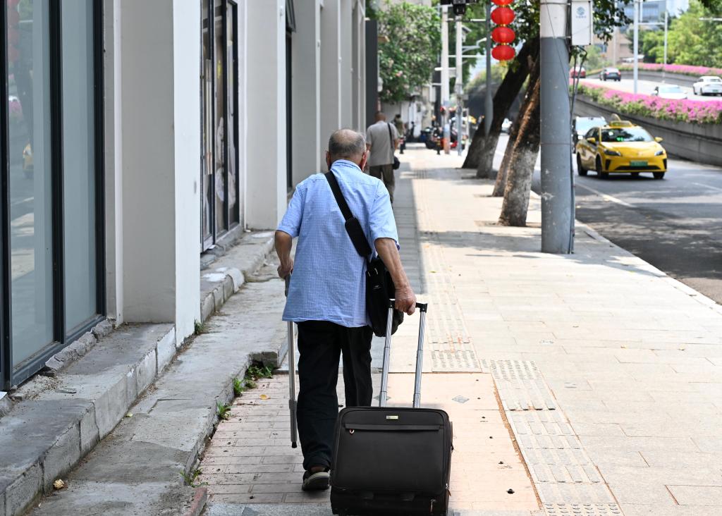↑4月19日,林宝山拉着行李箱走在去摆摊的路上。