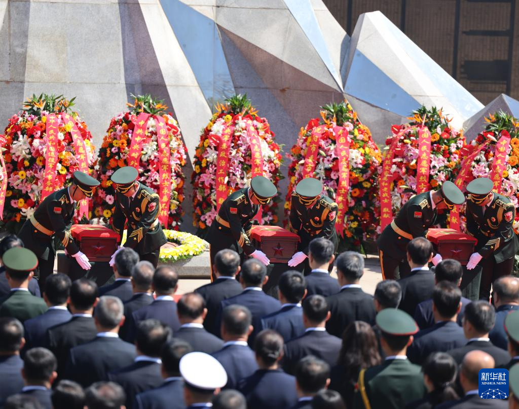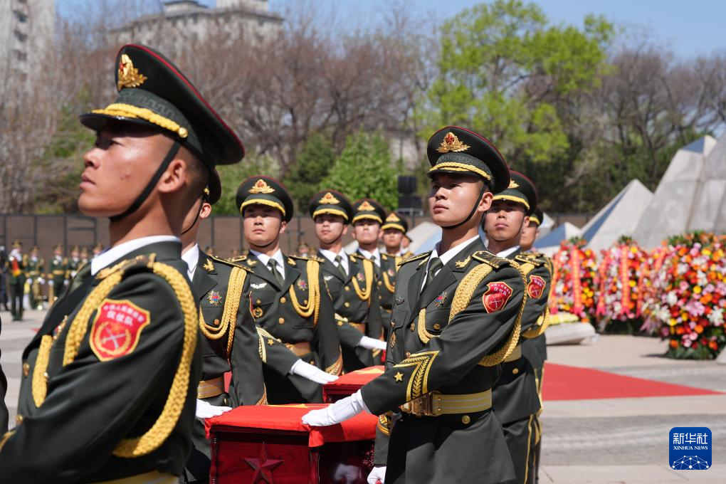 4月23日,在沈阳抗美援朝烈士陵园,志愿军烈士棺椁摆放在纪念广场。