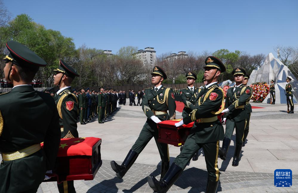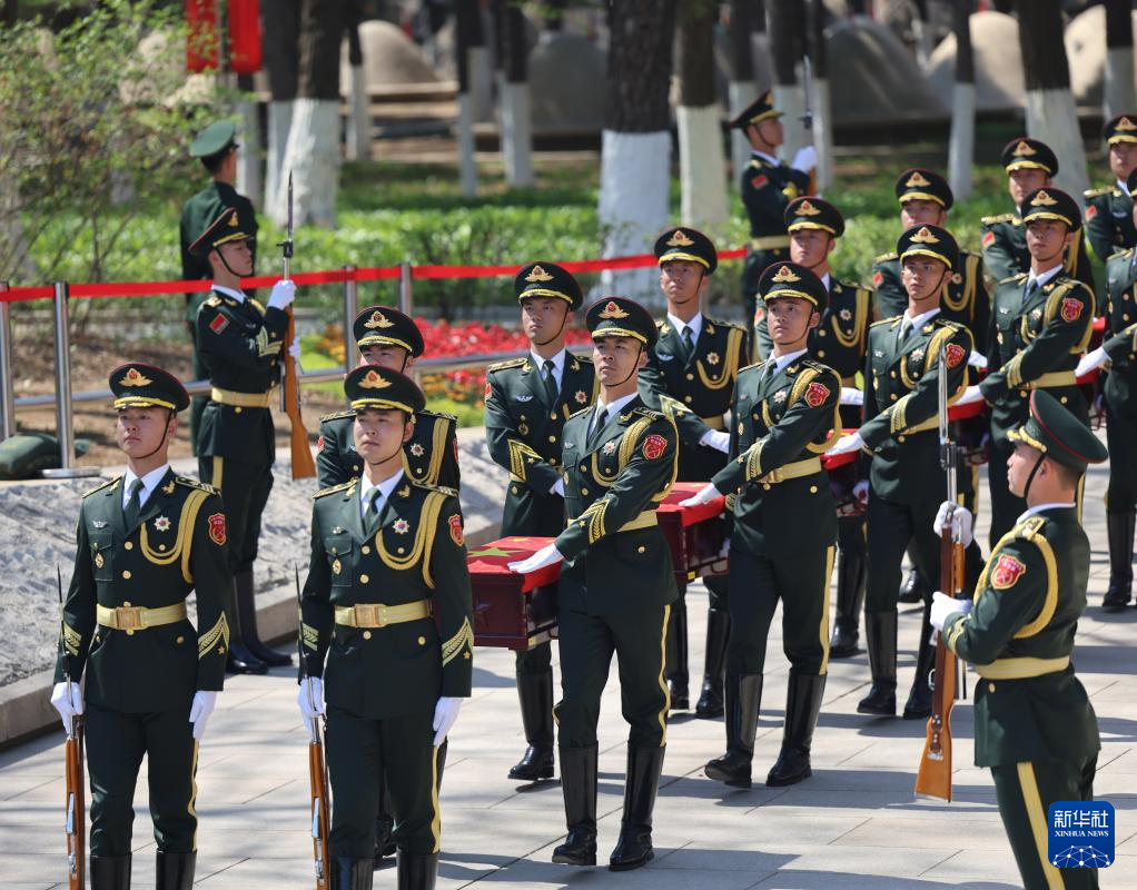 4月23日,在沈阳抗美援朝烈士陵园,礼兵护送志愿军烈士棺椁缓步进入纪念广场。