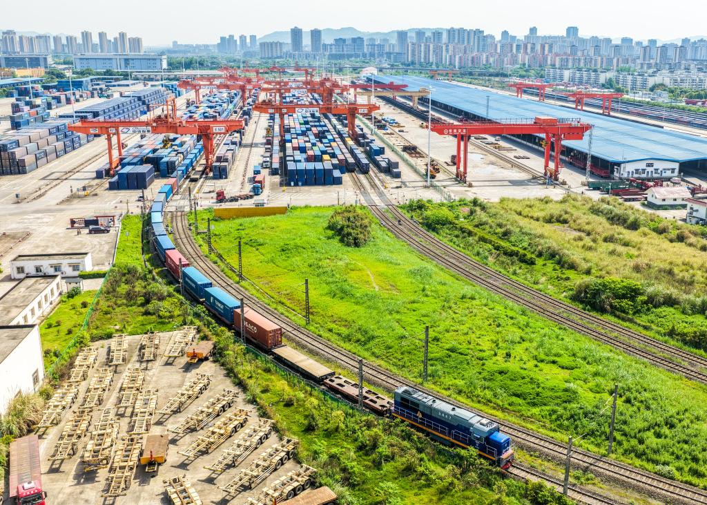 4月23日,一列装载汽车配件、机械机具等货物的中欧班列在重庆团结村站顺利发车(无人机照片)。新华社记者 唐奕 摄