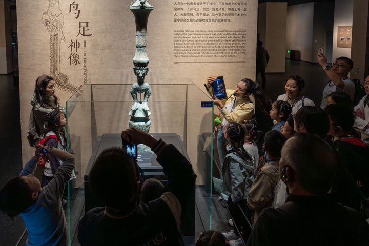 2026年4月3日,讲解员在三星堆博物馆为游客讲解展品。2026年全国多地推行中小学春假,带动文博研学热潮。三星堆博物馆也迎来亲子研学与参观高峰。