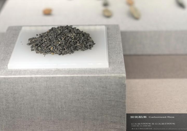 2025年12月12日在上海大学博物馆新馆的“玉见文明:良渚文化特展”上拍摄的炭化稻米。良渚古城遗址真实、完整地保存至今,为中国5000年文明史提供独特的见证。良渚遗址的持续考古成果曾6次入选“全国十大考古新发现”。